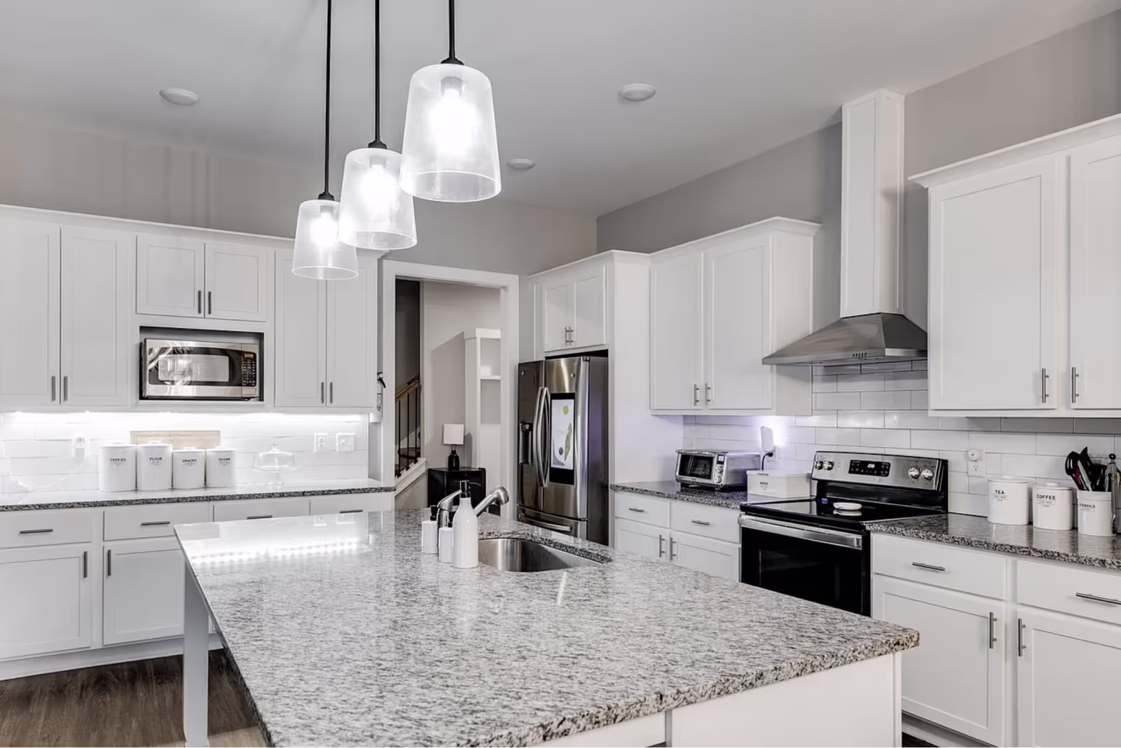 The main level boasts an open-concept design, featuring 3 bedrooms, 2 baths, and a dedicated office space. The heart of the home is the gourmet kitchen, complete with a large island perfect for entertaining, white shaker cabinets, granite countertops, and a stylish subway tile backsplash.